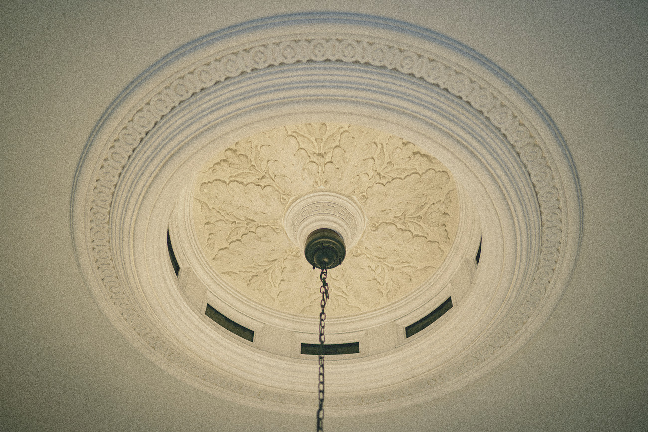 室内は漆喰塗りで、美しいモールディング(縁取り)が巡らされています。特に天井中央には、一般家庭には見られないほど巨大なアカンサスの葉をモチーフとした円形の中心飾りがあります。
