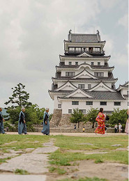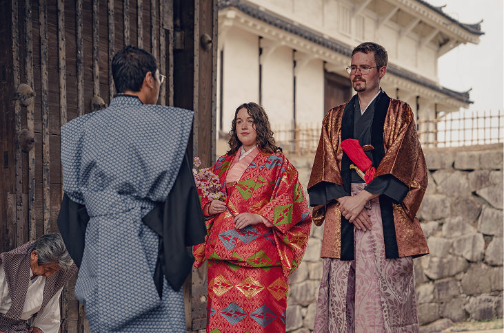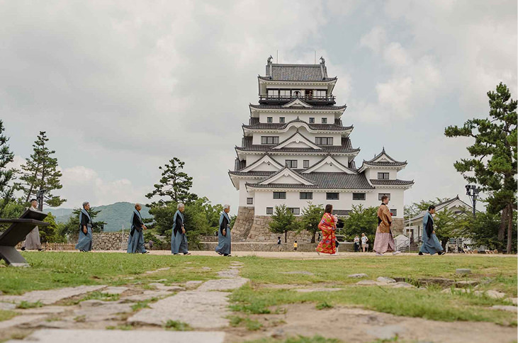 雄大な福山城をバックにした、開放的な日本庭園でのセレモニー。